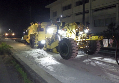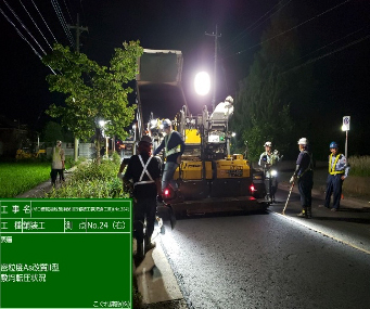 | 工事担当者のコメント | 当現場は、小学校・高校に面する舗装修繕工事であり、生徒の往来や送迎バスの出入りが多いため夜間工事での作業となりました。近隣住民の方には、事前に工事説明し理解を得たことで、事故・クレームなく完成することができました。 |