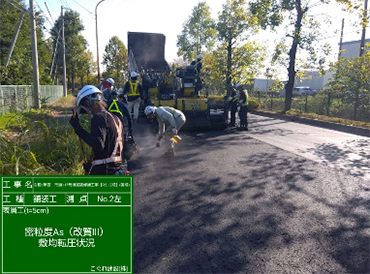 | 工事担当者のコメント | 入社して初めて担当した工事で施工前からずっと緊張し、施工中も慌ただしく動き回ってたのですが、最終的に事故やクレームもなく無事竣工することができました。また、工程通りに施工ができ、舗装の仕上がりも良かったです。 次回担当する工事の時には、今回の工事以上に協力業者との打合せや施工中の指示などをうまく伝えられるようにしていきたいと思います。 |