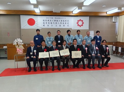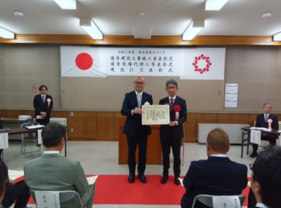 令和7年度の県土づくり優秀工事の授賞式が11月19日に行われ、弊社の『社資交付金(河川)工事(下忍調節池・遮水工)』が優秀現場代理人等表彰を受賞しました。